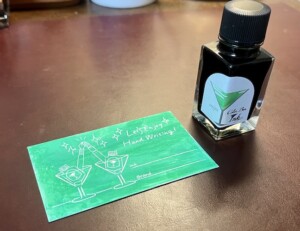 文具女子博限定インクの「ときめきのクリームソーダ」と迷ったのですが、今回は一色1つと決めていたので、こちらの「モヒート」を選びました。こちらは「カラーバーインク」シリーズの中でも人気の商品らしいです。鮮やかなグリーンの発色がとても綺麗です。最近バーに行くようになったのですが「モヒート」はいつも頼んでしまうほど好きなカクテルで、名前的にも外せませんでした。
