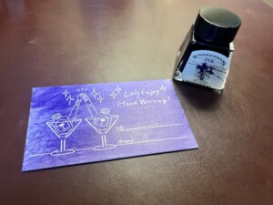 最後に紫部門で選択したのが、WINSOR&NEWTONのドローイングインク「VIOLET」をご紹介します。紫のインクもなかなか種類がないですね。ドローイングインクシリーズもカラーバリエーションが豊富で、さらに1ボトル¥352(税込)/普通色 とお値段が手頃なのも嬉しいところ。思わず全色揃えたくなってしまいます。こちらはガラスペン、つけぺん、筆用のインクで万年筆には使えないので注意が必要です。
